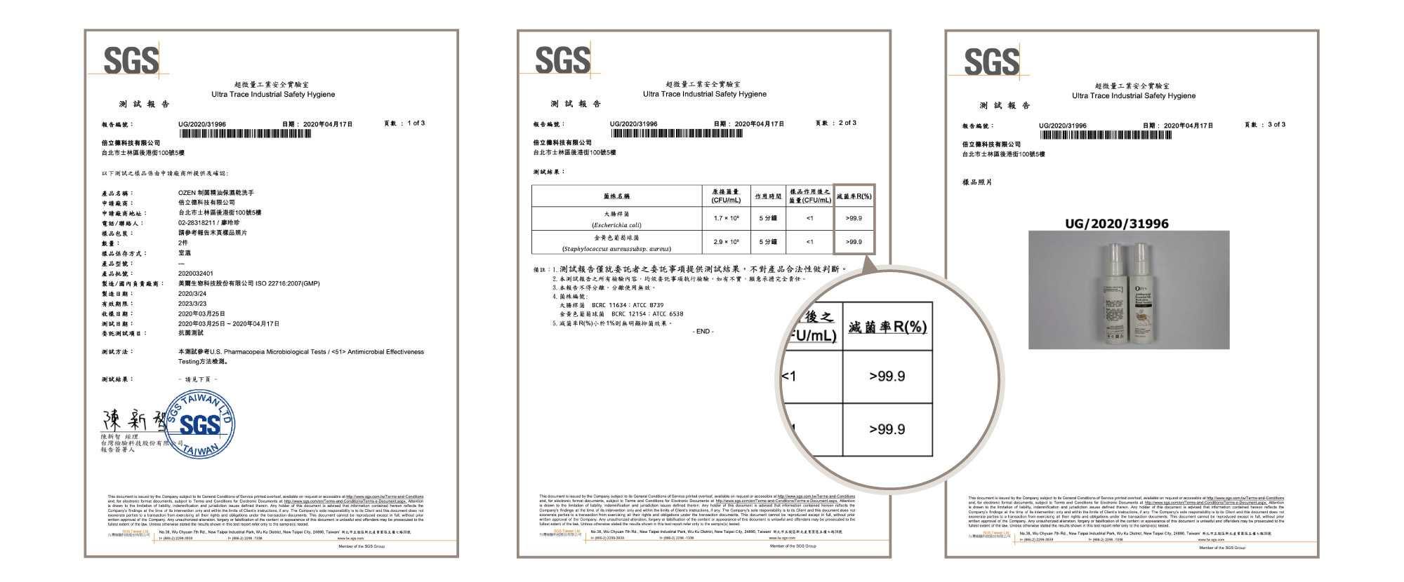 SGS 測試報告顯示,噴霧後 5 分鐘後的滅菌率高達 99.9%
