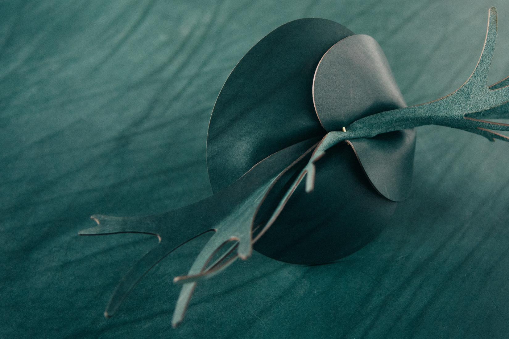 以「科學繪畫」描繪葉片特徵、收斂外型線條,搭配獨家皮塑技術、摺紙的立體成型概念,從平面皮料創造出簡約獨特的皮革永生鹿角蕨。